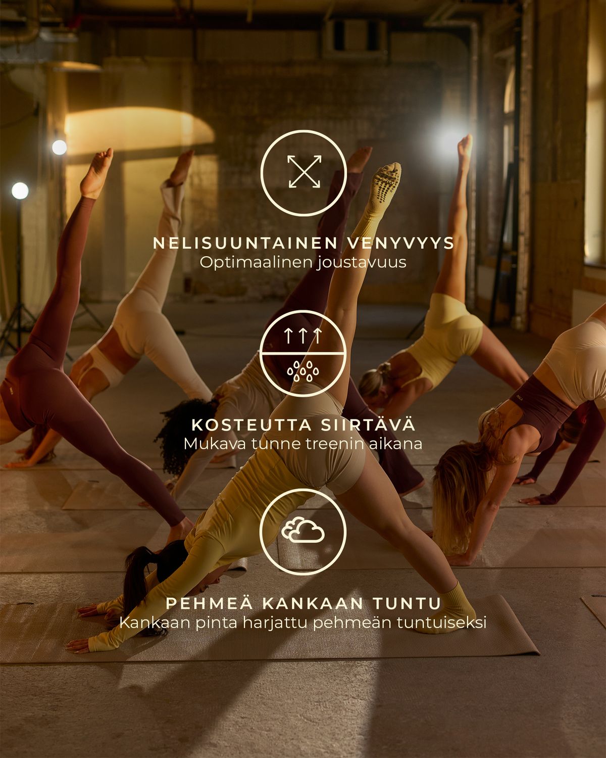 Tämän kauden jooga- ja pilatesmallisto kohtaa voiman. Suunniteltu intensiiviseen liikkeeseen, maadoitettuun voimaan ja täyteen kehonhallintaan. Materiaalit, jotka istuvat hyvin myös silloin kun työ käy raskaaksi. Jotka pitävät muodon, fokuksen ja intention jokaisessa asennossa.