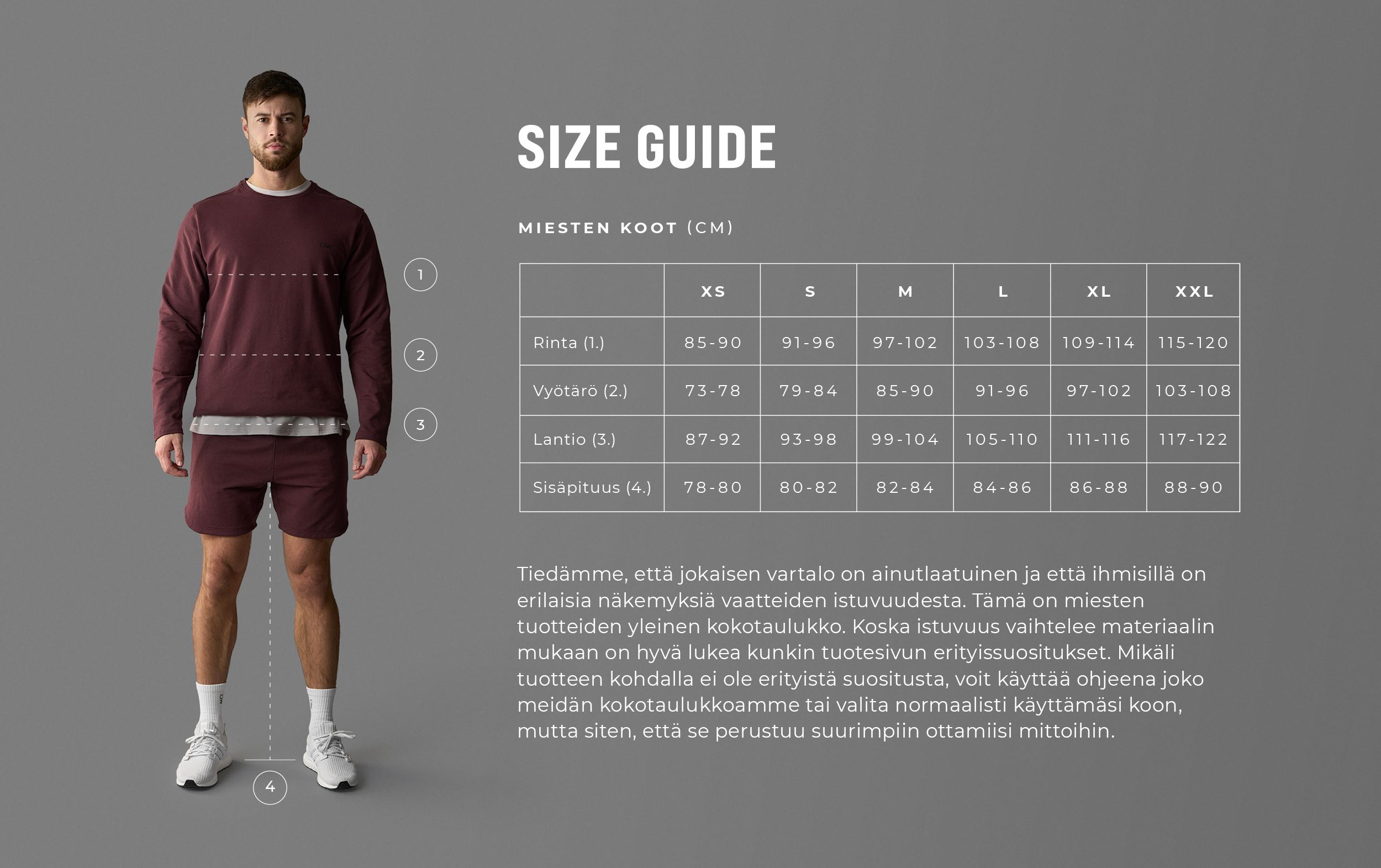 Koko-oppaamme auttaa sinua löytämään vaatteen joka istuu parhaiten juuri sinulle. Tiedämme myös, että kaikki vartalot ovat erilaisia ja että kaikilla on oma mieltymyksensä kuinka vaatteen tulisi istua päällä. Alla olevan koko-oppaan olemme luoneet sen perusteella, kuinka ajattelimme vaatteiden istuvan kun piirsimme ne ja kaikki koot ovat yleisiä. Koska vaatteen istuvuus on erilainen eri materiaalien välillä, niin pyydämme sinua vielä katsomaan tuotteen suositukset tuotesivulta täydentämään koko-opastamme. Mikäli tuotesivulla ei erikseen lue suosituksia, voit mennä oppaamme ja sen mukaan mitä kokoa normaalisti käytät.