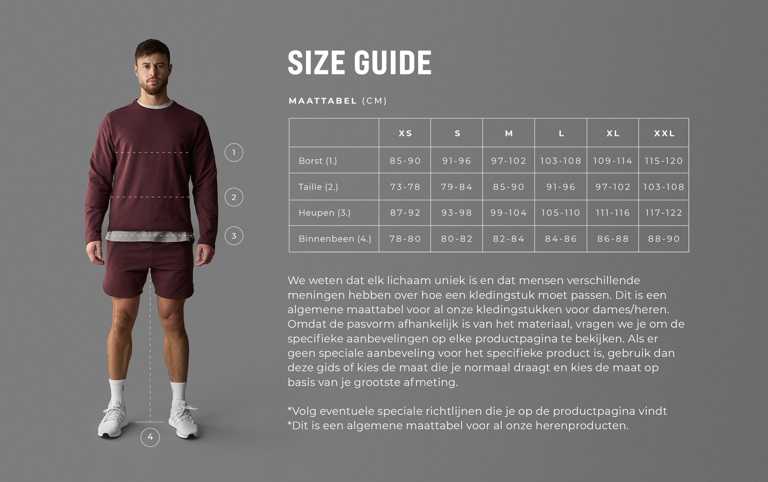 Bij ICIW vervaardigen we hoogwaardige kleding voor iedereen. We willen je helpen je doelen te bereiken, wat deze ook zijn. Met onze maattabel kun je ervoor zorgen dat een kledingstuk perfect past. We weten ook dat elk lichaam uniek is en dat mensen verschillende meningen hebben over hoe een kledingstuk moet passen. De onderstaande maattabel is gemaakt op basis van onze mening over de pasvorm van de producten toen we ze ontwierpen en de maten zijn bedoeld als algemene richtlijn. Omdat de pasvorm afhankelijk is van het materiaal, vragen we je om de specifieke aanbevelingen op elke productpagina te bekijken. Als er geen speciale aanbeveling voor het specifieke product is, gebruik dan deze gids of kies de maat die je normaal draagt.